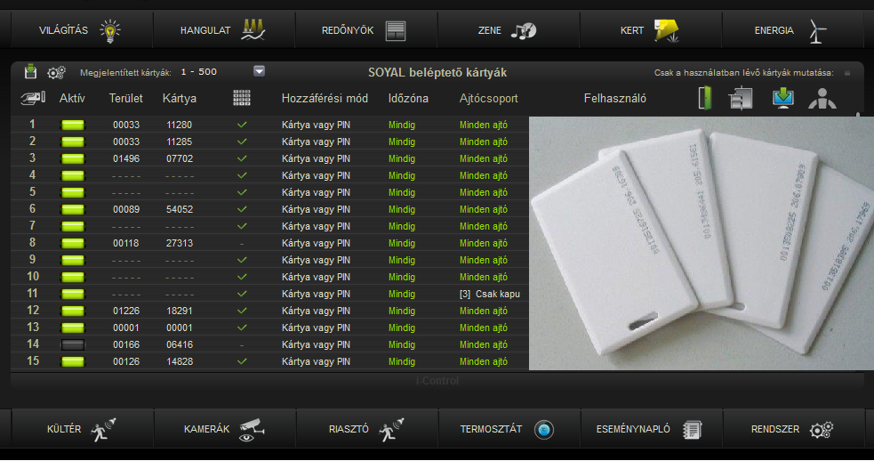 Az i-Control alkalmas kártyás, számkódos, illetve ujjlenyomatolvasó alapú beléptető terminálok kezelésére is. A jogosultságok távolról is programozhatók, minden belépés/kilépés naplózásra kerül, mely az általános eseménynaplóba kerül. A rendszerbe integrált biztonsági kamerák segítségével lehetősé van arra, hogy belépési események esetén fotó is készüljön, melyről megállapítható, hogy valóban a jogos felhasználó lépett-e be a védett terület(ek)re.